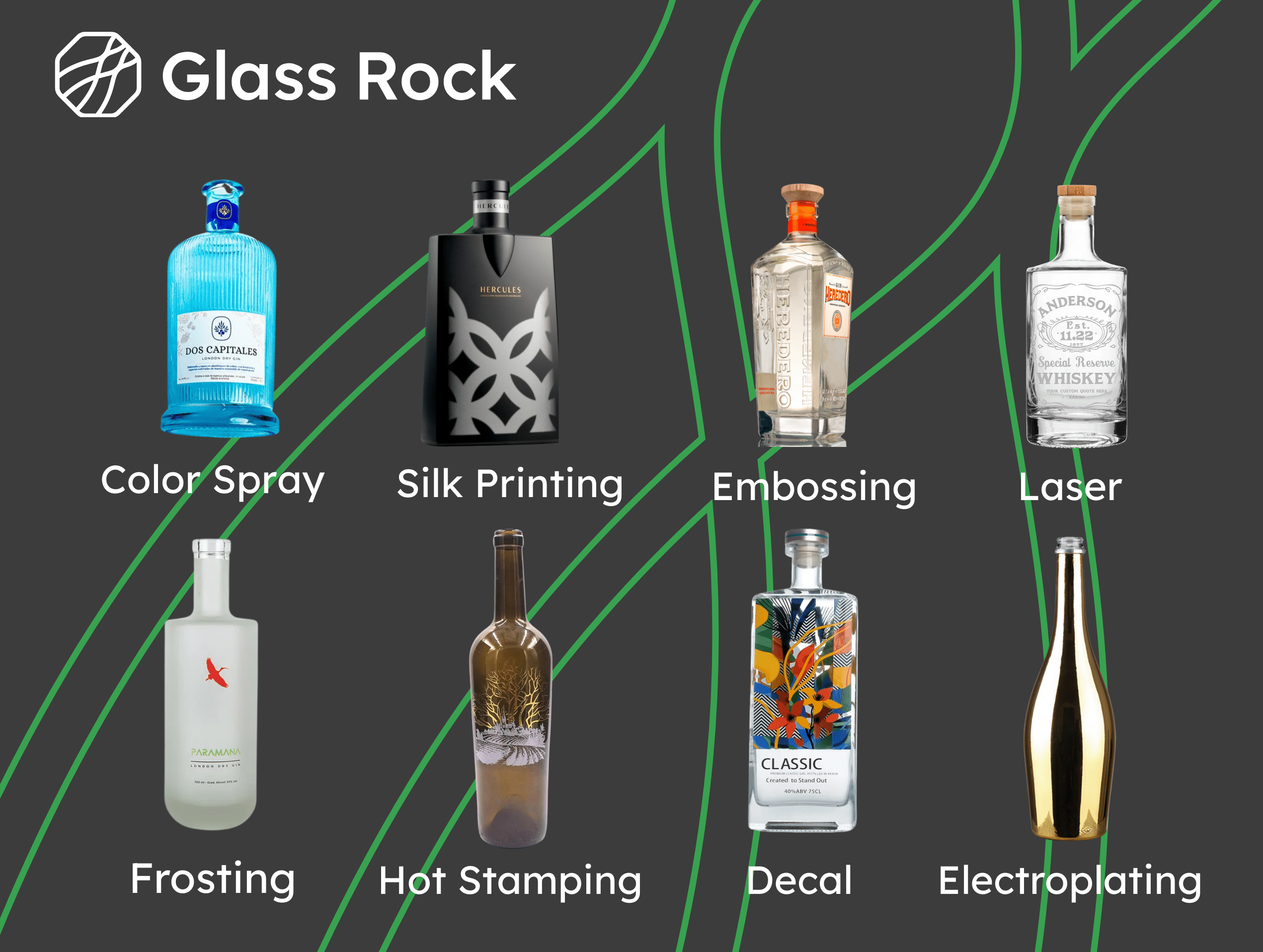 Specify any decoration techniques you’d like to consider either directly on the bottle (such as embossing, screen-printing, frosting, or painting)